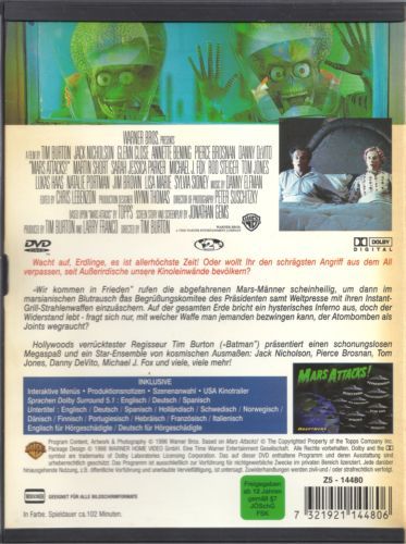 "Wir kommen in Frieden" rufen die abgefahrenen Mars-Männer scheinheilig, um dann im marsianischen Blutrausch das Begrüßungskomitee des Präsidenten samt Weltpresse mit ihren Instant-Grill-Strahlenwaffen einzuäschern. Auf der gesamten Erde bricht ein hysterisches Inferno aus, doch der Widerstand lebt - fragt sich nur, mit welcher Waffe man jemanden bezwingen kann, der Atombomben als Joints wegraucht?Hollywoods verrücktester Regisseur Tim Burton ("Batman") präsentiert einen schonungslosen Megaspaß und ein Star-Ensemble von kosmischen Ausmaßen: Jack Nicholson, Pierce Brosnan, Tom Jones, Danny DeVito, Michael J. Fox und viele, viele mehr!