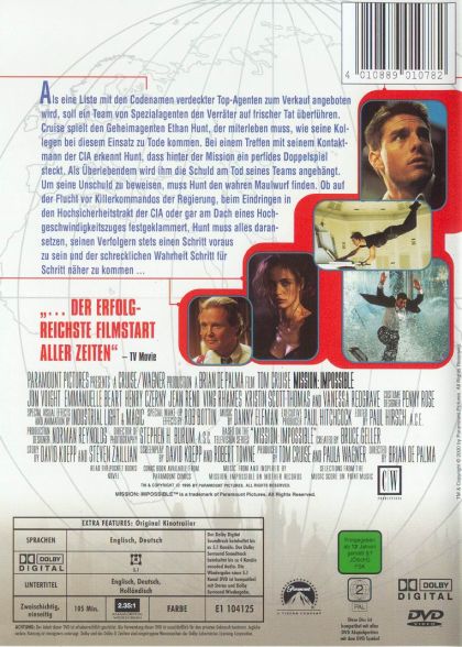 Als eine Liste mit den Codenamen verdeckter Top-Agenten zum Verkauf angeboten wird, soll ein Team von Spezialagenten den Verräter auf frischer Tat überführen. Cruise spielt den Geheimagenten Ethan Hunt, der miterleben muss, wie seine Kollegen bei diesem Einsatz zu Tode kommen. Bei einem Treffen mit seinem Kontaktmann der CIA erkennt Hunt, dass hinter der Mission ein perfides Doppelspiel steckt. Als Überlebendem wird ihm die Schuld am Tod seines Teams angehängt. Um seine Unschuld zu beweisen, muss Hunt den wahren Maulwurf finden. Ob auf der Flucht vor Killerkommandos der Regierung, beim Eindringen in den Hochsicherheitstrakt der CIA oder gar am Dach eines Hochgeschwindigkeitszuges festgeklammert, Hunt muss alles daransetzen, seinen Verfolgern stets einen Schritt voraus zu sein und der schrecklichen Wahrheit Schritt für Schritt näher zu kommen...