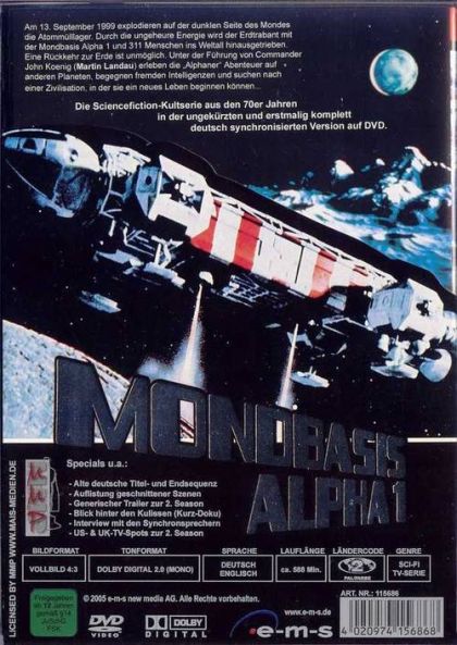 Am 13. September 1999 explodieren auf der dunklen Seite des Mondes die Atommülllager. Durch die ungeheure Energie wird der Erdtrabant mit der Mondbasis Alpha 1 und 311 Menschen in die Tiefen des Weltalls hinausgetrieben. Eine Rückkehr zur Erde ist unmöglich. Unter der Führung von Commander John Koenig (Martin Landau) erleben die "Alphaner" Abenteuer auf anderen Planeten, begegnen fremden Intelligenzen und suchen nach einer Zivilisation, in der sie in neues Leben beginnen können ... 25. Die Metamorphose (The Metamorph)26. Die Verstoßenen (The Exiles)27. Das Androidenvolk (One Moment of Humanity) -- dt. Erstveröffentlichung28. Schottische Geschichten (All That Glisters)29. Der entscheidende Stoff (Journey to Where)30. Der Händler (The Taybor) -- dt. Erstveröffentlichung31. Die Aussätzigen von Achanon (The Rules of Luton) -- dt. Erstveröffentlichung32. Rühr nicht die Pflanze an! (The Mark of Archanon)33. Der Schöpfer (Brian the Brain) -- dt. Erstveröffentlichung34. Der Roboter (New Adam, New Eve) -- dt. Erstveröffentlichung35. Planet der Wartenden (Catacombs of the Moon)36. Gegen die Zeit (The A B Chrysalis)