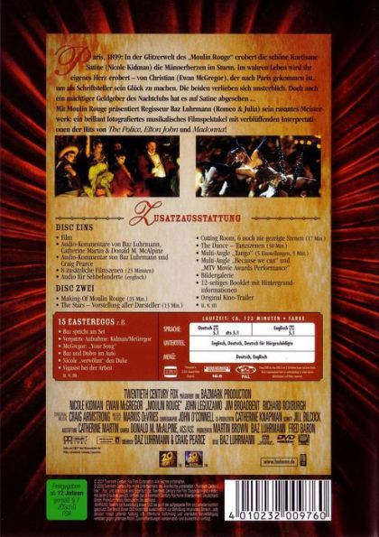 Paris 1899: In der Glitzerwelt des "Moulin Rouge" erobert die schöne Kurtisane Satine (Nicole Kidman) die Männerherzen im Sturm. Im wahren Leben wird ihr eigenes Herz erobert - von Christian (Ewan McGregor), der nach Paris gekommen ist, um als Schriftsteller sein Glück zu machen. Die beiden verlieben sich unsterblich. Doch auch ein mächtiger Geldgeber des Nachtclubs hat es auf Satine abgesehen...Mit Moulin Rouge präsentiert Regisseur Baz Luhrmann (Romeo & Julia) sein rasantes Meisterwerk: ein brillant fotografiertes musikalisches Filmspektakel mit verblüffenden Interpretationen der Hits von The Police, Elton John und Madonna!