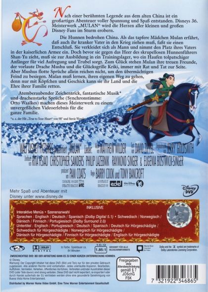 Nach einer berühmten Legende aus dem alten China ist ein großartiges Abenteuer voller Spannung und Spass entstanden. Disneys 36. Meisterwerk "MULAN" wird die Herzen aller kleinen und großen Disney-Fans im Sturm erobern.Die Hunnen bedrohen China. Als das tapfere Mädchen Mulan erfährt, daß auch ihr kranker Vater in den Krieg ziehen muß, faßt sie einen Entschluß. Sie verkleidet sich als Mann und nimmt den Platz ihres Vaters in der kaiserlichen Armee ein. Doch bevor sie gegen das Heer des skrupellosen Hunnenführers Shan-Yu zieht, muß sie zur Ausbildung in ein Trainingslager, wo ein Haufen tolpatschiger Anfänger für viel Aufregung und Trubel sorgt. Zum Glück stehen Mulan ihre treuen Freunde, der vorlaute Drache Mushu und die Glücksgrille Kriki, immer mit Rat und Tat zur Seite. Aber Mushus flotte Sprüche allein reichen nicht, um den übermächtigen Feind zu besiegen. Mulan muß erst lernen, ihren eigenen Weg zu gehen, denn nur mit Köpfchen und Geschick kann sie ihr Land und die Ehre ihrer Familie retten.Atemberaubender Zeichentrick, fantastische Musik (u.a. der Hit "True to Your Heart" von 98° und Stevie Wonder) und drachenstarke Sprüche (Synchronstimme: Otto Waalkes) machen dieses Meisterwerk zu einem unvergeßlichen Videoerlebnis für die ganze Familie.