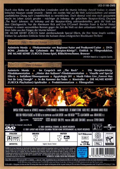 Durch eine Reihe von unglücklichen Umständen wird die Mumie Imhotep (Arnold Vosloo) in einem britischen Museum wieder erweckt - bereit, ein zweites Mal auf die Welt zurückzukehren und seinen unerbittlichen Drang nach Unsterblichkeit zu verwirklichen. Doch diesmal wird eine noch grausamere Macht ins Leben zurück gerufen - mächtiger als Imhotep: der gefürchtete Skorpion-König (Dwayne "The Rock" Johnson). Als Imhotep und der Skorpion-König aufeinandertreffen, gerät die Welt aus dem Gleichgewicht. Nur die Abenteurer Rick und Evie O'Connell (Brendan Fraser & Rachel Weisz) könnten in einem verzweifelten Rennen gegen die Zeit die Welt vor dem unfassbaren Bösen retten und ihren Sohn aus den Fängen der Mumie befreien!DIE MUMIE KEHRT ZURÜCK bietet atemberaubende Special Effects, die Ihre Sinne fesseln werden. Erleben Sie außerdem Einblicke hinter die Kulissen dieses erfolgreichen Blockbuster-Thrillers!