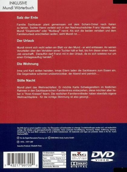 Salz der ErdeFamilie Sackbauer plant gemeinsam mit dem Schani-Onkel nach Italien zu fahren. Tochter Hanni verliebt sich in den Nachwuchsdichter Franz Vejvoda, den Mundl "Dioptrinotto" oder "Nudlaug" nennt. Als sich die beiden verloben und dem Familienurlaub anschließen wollen, sieht Mundl rot...Der UrlaubMundl nimmt sich recht selten ein Blatt vor den Mund - er wird entlassen. An seinen Vorurteilen über den Verlobten seiner Tochter hält er fest, bis ihm dieser einen neuen Job verschafft. Daraufhin darf Franzi mit in den Urlaub, da es sich sowieso nur um einen Eintagesausflug handelt...Die WohnungIrma und Karli wollen heiraten. Irmas Eltern laden die Sackbauers zum Essen ein. Die Gegensätze scheinen unüberbrückbar, der Abend wird peinlich...Stille NachtMundl plant das Weihnachtsfest. Er möchte Karlis Schwiegereltern im festlichen Rahmen in den Sackbauerischen Familienkreis einbeziehen, diese möchten aber lieber in "ihren Kreisen" feiern. Die restlichen Familienmitglieder haben ebenfalls eigene Weihnachtspläne - für die richtige Stimmung ist also gesorgt...