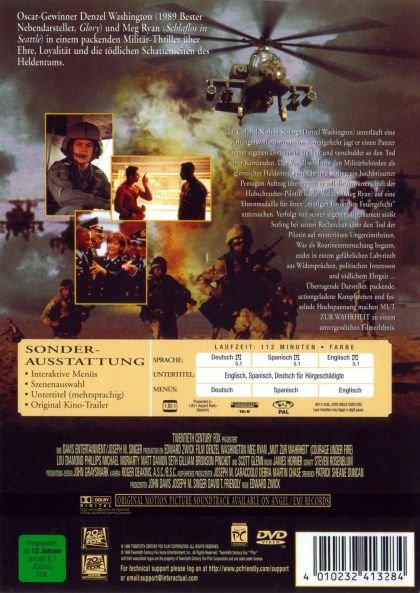 Oscar-Gewinner Denzel Washington (1989 Bester Nebendarsteller, Glory) und Meg Ryan (Schlaflos in Seattle) in einem packenden Militär-Thriller über Ehre, Loyalität und die tödlichen Schattenseiten des Heldentums.Lt. Colonel Nathan Serling (Denzel Washington) unterläuft ein verhängnisvoller Irrtum - im Kampfgefecht jagt er einen Panzer seiner eigenen Division in die Luft und verschuldet so den Tod seiner Kameraden. Der Vorfall wird von den Militärbehörden als glorreicher Heldentod vertuscht und Serling ein hochbrisanter Pentagon-Auftrag übertragen; er soll die Anwärterschaft der Hubschrauber-Pilotin Karen Walden (Meg Ryan) auf eine Ehrenmedaille für ihren "mutigen Einsatz im Feuergefecht" untersuchen. Verfolgt von seinen eigenen Alpträumen stößt Serling bei seinen Recherchen über den Tod der Pilotin auf mysteriöse Ungereimtheiten. Was als Routineuntersuchung begann, endet in einem gefährlichen Labyrinth aus Widersprüchen, politischen Interessen und tödlichem Ehrgeiz...