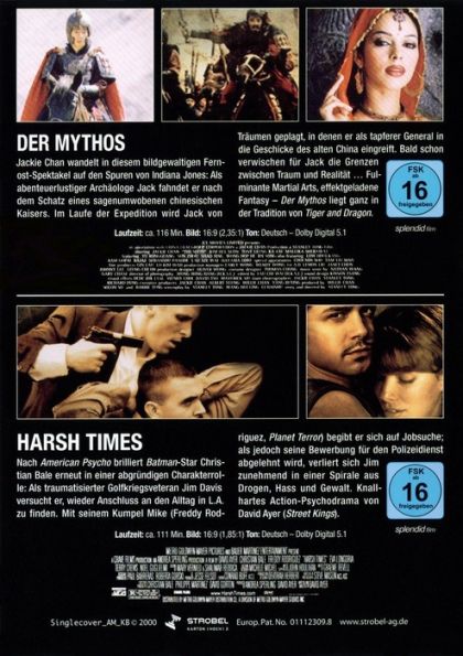 DER MYTHOSJackie Chan wandelt in diesem bildgewaltigen Fernost-Spektakel auf den Spuren von Indiana Jones: Als abenteuerlustiger Archäologe Jack fahndet er nach dem Schatz eines sagenumwobenen chinesischen Kaisers. Im Laufe der Expedition wird Jack von Träumen geplagt, in denen er als tapferer General in die Geschicke des alten China eingreift. Bald schon verwischen für Jack die Grenzen zwischen Traum und Realität Fulminante Martial Arts, effektgeladene Fantasy - Der Mythos liegt ganz in der Tradition von Tiger and Dragon.HARSH TIMESNach American Psycho brilliert Batman-Star Christian Bale erneut in einer abgründigen Charakterrolle: Als traumatisierter Golfkriegsveteran Jim Davis versucht er, wieder Anschluss an den Alltag in L.A. zu finden. Mit seinem Kumpel Mike (Freddy Rodriguez, Planet Terror) begibt er sich auf Jobsuche; als jedoch seine Bewerbung für den Polizeidienst abgelehnt wird, verlien sich Jim zunehmend in einer Spirale aus Drogen, Hass und Gewalt. Knallhartes Action-Psychodrama von freigegeben David Ayer (Street Kings).
