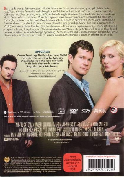 Sex. Verführung. Fett absaugen. All das finden wir in der respektlosen, preisgekrönten Serie Nip/Tuck, die die Fernsehunterhaltung buchstäblich einschneidend verändert... und so auch die Diskussion darüber anheizt, was die Schönheitschirurgie für einen Patienten leisten kann - und was nicht. Dylan Walsh und Julian McMahon spielen zwei beste Freunde und Fachärzte für plastische Chirurgie, in deren nobler South-Beach-Praxis natürlich auch in der vierten Serienstaffel kontroverse Themen ebenso auf den OP-Tisch kommen (darunter eine gruselige Story über eine Organspenden-Mafia) wie menschliche Macken (ein Bauchredner will wie seine Puppe aussehen). Als Gaststars sind Jacqueline Bisset, Larry Hagman, Alanis Morissette, Mo'Nique, Rosie O'Donnell, Brooke Shields und andere zu sehen. Also jede Menge Spannung, Schocks, Stars und Überraschungen auf den fünf DVDs dieses Sets - nichts, was sich nicht mit einem kleinen Schnitt und ein bisschen Straffen lösen ließe.