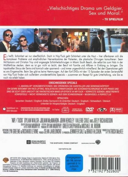 Es heißt, Schönheit sei nur oberflächlich. Doch in Nip/Tuck geht Schönheit unter die Haut - hier offenbaren sich die komplexen Probleme und empfindlichen Nervenkostüme der Patienten, die plastische Chirurgen konsultieren: Sean McNamara und Christian Troy sind angesagte Schönheitschirurgen in Miami South Beach, die selbst bis zum Hals in der Midlife-Krise stecken, denn es ist gar nicht so leicht, den Beruf mit Familie und Affären in Einklang zu bringen. Die topaktuellen Storys der Serie sind komisch und spannend - und immer ungewöhnlich mitreißend. Bei den Operationen geht es ans Eingemachte. Beim Sex gibt es keine Hemmungen. Auf den fünf DVDs mit den 13 Episoden der ersten Serienstaffel von Nip/Tuck finden sich außerdem unwiderstehliche Specials - zusammen ein Rezept für gute Unterhaltung, wie Sie es noch nie erlebt haben.Episode 1: Mc Namara / TroyEpisode 2: Mandi / RandiEpisode 3: Nanette BabcockEpisode 4: Sofia LopezEpisode 5: Kurt DempseyEpisode 6: Megan O’HaraEpisode 7: Cliff MantegnaEpisode 8: Cara FitzgeraldEpisode 9: Sofia Lopez Teil 2Episode 10: Adelle CoffinEpisode 11: Montana / Sassy / JusticeEpisode 12: Antonia RamosEpisode 13: Escobar Gallardo