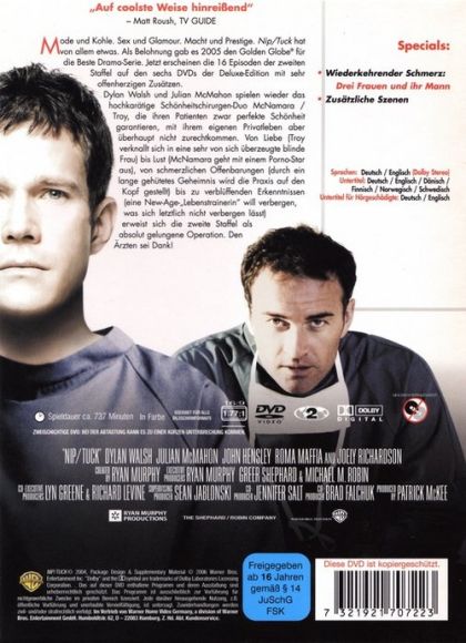 Mode und Kohle. Sex und Glamour. Macht und Prestige. Nip/Tuck hat von allem etwas. Als Belohnung gab es 2005 den "Golden Globe" für die beste Drama-Serie. Jetzt erscheinen die 16 Episoden der zweiten Staffel auf den sechs DVDs der Deluxe-Edition mit sehr offenherzigen Extras.Dylan Walsh und Julian McMahon spielen wieder das hochkarätige Schönheitschirurgen-Duo McNamara / Troy, die ihren Patienten zwar perfekte Schönheit garantieren, mit ihrem eigenen Privatleben aber überhaupt nicht zurechtkommen. Von Liebe (Troy verknallt sich in eine sehr von sich überzeugte blinde Frau) bis Lust (McNamara geht mit einem Porno-Star aus), von schmerzlichen Offenbarungen (durch ein lange gehütetes Geheimnis wird die Praxis auf den Kopf gestellt) bis zu verblüffenden Erkenntnissen (eine New-Age-"Lebenstrainerin" will verbergen, was sich letztlich nicht verbergen lässt) erweist sich die zweite Staffel als absolut gelungene Operation. Den Ärzten sei Dank!Episode 1: Erica NoughtonEpisode 2: Christian TroyEpisode 3: Manya MabikaEpisode 4: Mrs. GrubmanEpisode 5: Joel GideonEpisode 6: Bobbi BroderickEpisode 7: Naomi GainesEpisode 8: Agatha RippEpisode 9: Rose and Raven RosenbergEpisode 10: Kimber HenryEpisode 11: Natasha CharlesEpisode 12: Julia McNamaraEpisode 13: Oona WentworthEpisode 14: Trudy NyeEpisode 15: Sean McNamaraEpisode 16: Joan Rivers