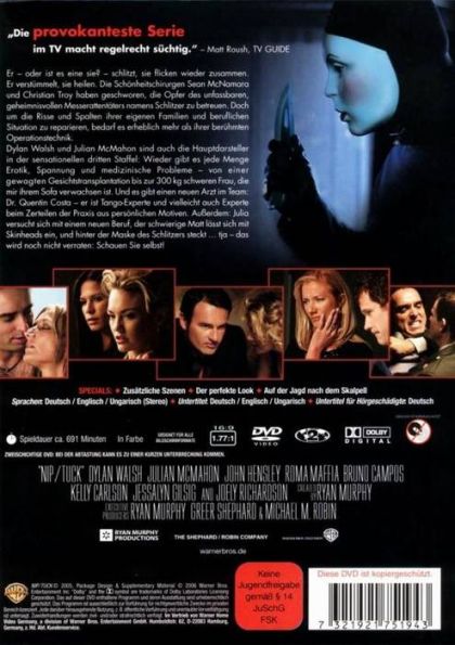 Er - oder ist es eine sie? - schlitzt, sie flicken wieder zusammen. Er verstümmelt, sie heilen. Die Schönheitschirurgen Sean McNamara und Christian Troy haben geschworen, die Opfer des unfassbaren, geheimniscollen Messerattentäters namens Schlitzer zu betreuen. Doch um die Risse und Spalten ihrer eigenen Familien und beruflichen Situation zu reparieren, bedarf es erheblich mehr als ihrer berühmten Operationstechnik.Dylan Walsh und Julian McMahon sind auch die Hauptdarsteller in der sensationellen dritten Staffel: Wieder gibt es eine Menge Erotik, Spannung und medizinischen Probleme - von einer gewagten Gesichtstransplantation bis zur 300 kg schweren Frau, die mit ihrem Sofa verwachsen ist. Und es gibt einen neuen Arzt im Team: Dr. Quentin Costa - er ist Tango-Experte und vielleicht auch beim Zerteilen der Praxis aus persönlichen Motiven. Außerdem: Julia versucht sich mit einem neuen Beruf, der schwierige Matt lässt sich mit Skinheads ein, und hinter der Maske des Schlitzers steckt ... tja - das wird noch nicht verraten: Schauen Sie selbst!