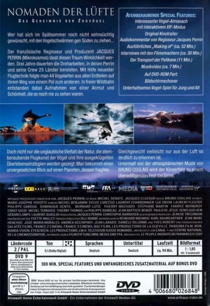 Wer hat sich im Spätsommer noch nicht sehnsüchtig gewünscht, mit den Vogelschwärmen gen Süden zu ziehen...Der französische Regisseur und Produzent JACQUES PERRIN (Mikrokosmos) lässt diesen Traum Wirklichkeit werden. Drei Jahre dauerten die Dreharbeiten, in denen Perrin und seine Crew 25 Länder bereisten. Mit Hilfe neuester Flugtechnik folgte man 44 Vogelarten aus allen Erdteilen auf ihrem Weg von einem Pol zum anderen. In freier Wildbahn entstanden dabei Aufnahmen von einer Anmut und Schönheit, die so noch nie zu sehen waren.Doch nicht nur die unglaubliche Vielfalt der Natur, die atemberaubende Flugkunst der Vögel und ihre ausgeklügelten Überlebensstrategien werden gezeigt: Man bekommt einen unvergesslichen Blick auf einen Planeten, dessen fragiles Gleichgewicht vielleicht nur aus der Luft so deutlich zu erkennen ist.Untermalt von der atmosphärischen Musik von BRUNO COULAIS wird der Kinoerfolg zu einem überwältigenden Fest der Sinne.