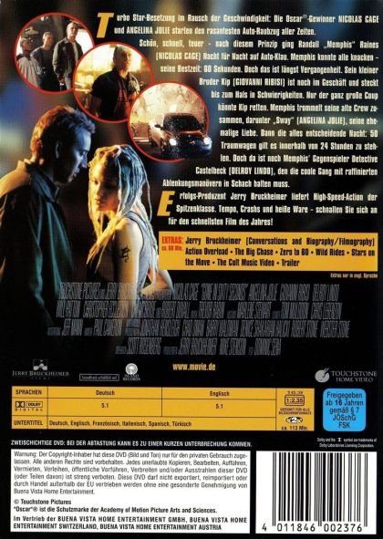 Turbo Star-Besetzung im Rausch der Geschwindigkeit: Die Oscar®-Gewinner NICOLAS CAGE und ANGELINA JOLIE starten den rasantesten Auto-Raubzug aller Zeiten.Schön, schnell, teuer - nach diesem Prinzip ging Randall "Memphis" Raines (NICOLAS CAGE) Nacht für Nacht auf Auto-Klau. Memphis konnte alle knacken - seine Bestzeit: 60 Sekunden. Doch das ist längst Vergangenheit. Sein kleiner Bruder Kip (GIOVANNI RIBISI) ist noch im Geschäft und steckt bis zum Hals in Schwierigkeiten. Nur der ganz große Coup könnte Kip retten. Memphis trommelt seine alte Crew zusammen, darunter "Sway" (ANGELINA JOLIE), seine ehemalige Liebe. Dann die alles entscheidende Nacht: 50 Traumwagen gilt es innerhalb von 24 Stunden zu stehlen. Doch da ist noch Memphis' Gegenspieler Detective Castelbeck (DELROY LINDO), den die coole Gang mit raffinierten Ablenkungsmanövern in Schach halten muss.Erfolgs-Produzent Jerry Bruckheimer liefert High-Speed-Action der Spitzenklasse. Tempo, Crashs und heiße Ware - schnallen Sie sich an für den schnellsten Film des Jahres!