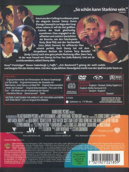 Kaum aus dem Gefängnis entlassen, plant der elegante Gauner Danny Ocean (George Clooney) in Las Vegas den Coup seines Lebens: Er will die drei größten Casinos der Stadt gleichzeitig ausnehmen. Dazu engagiert er die elf besten und coolsten Spezialisten der Branche, wie den Falschspieler Rusty (Brad Pitt) und den Taschendieb Linus (Matt Damon). Ihr raffinierter Plan scheint perfekt. Doch Danny hat mit dem skrupellosen Besitzer der Casinos Terry Benedict (Andy Garcia) noch eine ganz private Rechnung offen. Denn Terry ist der neue Freund von Dannys Ex-Frau Tess (Julia Roberts). Und um sie zurückzuerobern, riskiert Danny alles.Oscar®-Preisträger Steven Soderbergh ("Traffic", "Erin Brockovich") gelang der wohl coolste und lässigste Film der letzten Jahre. Und dem unglaublichen Staraufgebot merkt man den Spaß bei jeder Szene an.