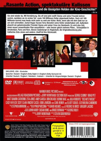 Sie sind wieder da. Mit Verstärkung. Die elf sind jetzt zwölf: Danny und seine Freunde kehren zurück, nachdem sie im ersten Teil coole 160 Millionen Dollar abgestaubt hatten. Doch mit 160 Millionen kommt man heute nicht mehr so weit wie früher. Nicht, wenn alle mit dem Geld nur so um sich schmeißen. Zumal Vegas-Tycoon Terry Benedict seine Kohle wiederhaben will. Außerdem pfuscht ein geheimnisvoller Fremder Danny und seiner Crew ins Handwerk. Es wird also Zeit, einen neuen umwerfenden Plan auszuführen - oder besser gleich mehrere Pläne... Schauplätze in Amsterdam, Paris und Rom, Steven Soderbergh im Regiestuhl, die Originalbesetzung plus Catherine Zeta-Jones und andere: Zwölf ist Ihre Glückszahl.