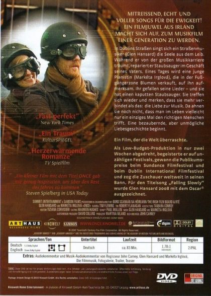 In Dublins Strassen singt sich ein Strassenmusiker die Seele aus dem Leib. Während er von der großen Musikkarriere träumt, repariert er Staubsauger im Geschäft seines Vaters. Eines Tages wird eine junge Pianistin, die in der Fußgängerzone Blumen verkauft, auf ihn aufmerksam. Ihr gefallen seine Lieder - und sie hat einen kaputten Staubsauger. Sie treffen sich wieder und merken, dass ie mehr verbindet als das: die Liebe zur Musik. Da ahnen sie noch nicht, dass man im Leben vielleicht nur ein einziges Mal den richtigen Menschen trifft. Eine bezaubernde aber unmögliche Liebesgeschichte beginnt. ...Ein Film, der die Welt überraschte. Als Low-Budget Produktion in nur zwei Wochen abgedreht, begeisterte er auf unzähligen Festivals, gewann beim Sundance-Filmfestival und beim Dublin International Filmfestival und zog die Zuschauer weltweit in seinen Bann. Für den Titelsong "Falling Slowly" wurde Glen Hansard 2008 mit dem Oscar ausgezeichnet.