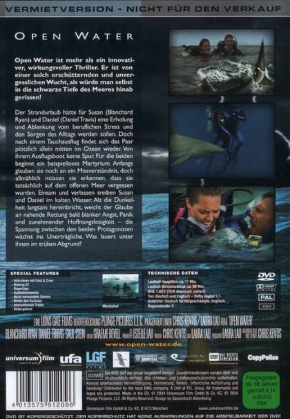 Open Water ist mehr als ein innovativer, wirkungsvoller Thriller. Er ist von einer solch erschütternden und unvergesslichen Wucht, als würde man selbst in die schwarze Tiefe des Meeres hinab gerissen!Der Strandurlaub hatte für Susan (Blanchard Ryan) und Daniel (Daniel Travis) eine Erholung und Ablenkung von beruflichen Stress und den Sorgen des Alltags werden sollen. Doch nach einem Tauchausflug findet sich das Paar plötzlich allein mitten im Ozean wieder. Von ihrem Ausflugsboot keine Spur. Für die beiden beginnt ein beispiellose Matyrium. Anfangs glauben sie noch an ein Missverständnis, doch allmählich müssen sie erkennen, dass sie tatsächlich auf dem offenen Ozean vergessen wurden. Einsam und verlassen im kalten Wasser, müssen Susan und Daniel jedoch bald erkennen, dass sie ganz auf sich allein gestellt sind. Als die Dunkelheit langsam hereinbricht, weicht der Glaube an nahende Rettung bald blanker Angst, Panik und zunehmender Hoffnungslosigkeit - die Spannung zwischen den beiden Protagonisten wächst ins Unerträgliche. Was lauert unter ihnen im trüben Abgrund?