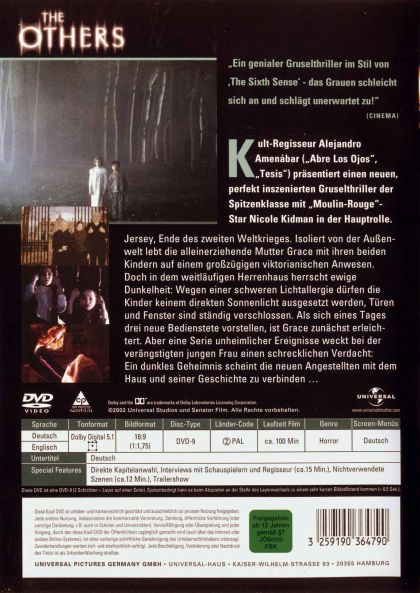 Kult-Regisseur Alejandro Amenábar ("Abre Los Ojos", "Tesis") präsentiert einen neuen, perfekt inszenierten Gruselthriller der Spitzenklasse mit "Moulin Rouge"-Star Nicole Kidman in der Hauptrolle.Jersey, Ende des zweiten Weltkrieges. Isoliert von der Außenwelt lebt die alleinerziehende Mutter Grace mit ihren beiden Kindern auf einem großzügigen viktorianischen Anwesen. Doch in dem weitläufigen Herrenhaus herrscht ewige Dunkelheit: Wegen einer schweren Lichtallergie dürfen die Kinder keinem direkten Sonnenlicht ausgesetzt werden, Türen und Fenster sind ständig verschlossen. Als sich eines Tages drei neue Bedienstete vorstellen, ist Grace zunächst erleichtert. Aber eine Serie unheimlicher Ereignisse weckt bei der verängstigten jungen Frau einen schrecklichen Verdacht: Ein dunkles Geheimnis scheint die neuen Angestellten mit dem Haus und seiner Geschichte zu verbinden ...