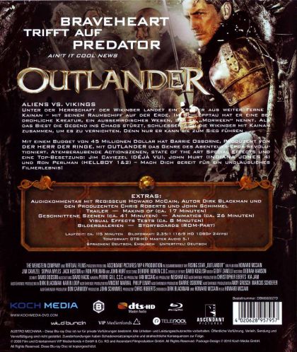 ALIENS VS. VIKINGSUnter der Herrschaft der Wikinger landet ein Krieger aus weiter Ferne - Kainan - mit seinem Raumschiff auf der Erde. Im Schlepptau hat er eine bedrohliche Kreatur, ein außerirdisches Wesen, das er "Morween" nennt. Als das Biest die Gegend ins Chaos stürzt, schließen sich die Wikinger mit Kainan zusammen, um es zu vernichten. Denn nur er kann sich zum Sieg führen...Mit einem Budget von 45 Millionen Dollar hat Barrie Osborne, Produzent von DER HERR DER RINGE, mit OUTLANDER das Genre des Abenteuer-Epos revolutioniert. Atemberaubende Actionszenen, State Of The Art Special Effects und eine Top-Besetzung: Jim Caviezel (DÉJÀ VU), John Hurt (INDIANA JONES 4) und Ron Perlman (HELLBOY 1&2) - Mach dich bereit für ein unglaubliches Filmerlebnis!