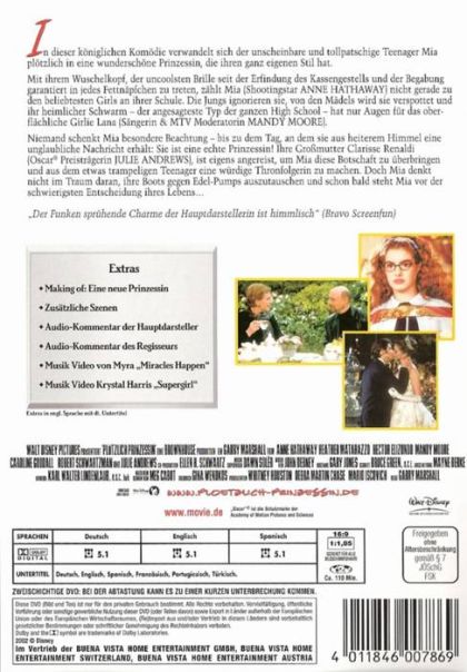 In dieser königlichen Komödie verwandelt sich der unscheinbare und tollpatschige Teenager Mia plötzlich in eine wunderschöne Prinzessin, die ihren ganz eigenen Stil hat.Mit ihrem Wuschelkopf, der uncoolsten Brille seit Erfindung des Kassengestells und der Begabung garantiert in jedes Fettnäpfchen zu treten, zählt Mia (Shootingstar ANNE HATHAWAY) nicht gerade zu den beliebtesten Girls an ihrer Schule. Die Jungs ignorieren sie, von den Mädels wird sie verspottet und ihr heimlicher Schwarm - der angesagteste Typ der ganzen High School - hat nur Augen für das oberflächliche Girlie Lana (Sängerin & MTV Moderatorin MANDY MOORE).Niemand schenkt Mia besondere Beachtung - bis zu dem Tag, an dem sie aus heiterem Himmel eine unglaubliche Nachricht erhält: Sie ist eine echte Prinzessin! Ihre Großmutter Clarisse Renaldi (Oscar Preisträgerin JULIE ANDREWS), ist eigens angereist, um Mia diese Botschaft zu überbringen und aus dem etwas trampeligen Teenager eine würdige Thronfolgerin zu machen. Doch Mia denkt nicht im Traum daran, ihre Boots gegen Edel-Pumps auszutauschen und schon bald steht Mia vor der schwierigsten Entscheidung ihres Lebens...