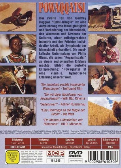 Der zweite Teil von Godfrey Reggios "Qatsi-Trilogie" ist eine Aufzeichnung von Mannigfaltigkeit und Veränderung der Menschheit, des Wachsens und Strebens der Kulturen, einer selbstgerechten Industrie und den Früchten individueller Arbeit, als Symphonie der Menschheit präsentiert Die musikalische Untermalung von Philip Glass, die schon "Koyaanisqatsi" zu einem audiovisuellen Erlebnis machte, bildet die perfekte Entsprechung: "Powaqqatsi ist eine visuelle, hypnotische Erfahrung unserer Welt"."Ein technisch perfekt inszenierter Bilderbogen" - Treffpunkt Film"Ein würdiger Nachfolger von Koyaanisqatsi"- Willi Bär,Cinema"Sehenswert" - Kölner Rundschau"Eine Hommage an die Magie der Bilder" - Die Welt"Ein Mammut-Musikvideo mit Hintersinn" BILD, München