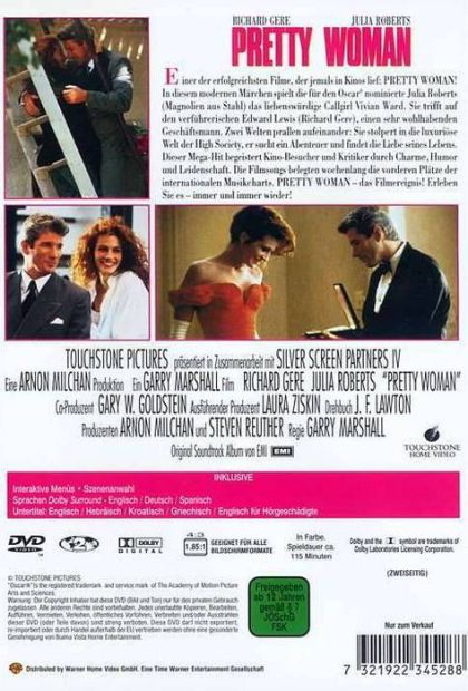 Einer der erfolgreichsten Filme, der jemals in Kinos lief: PRETTY WOMAN!In diesem modernen Märchen spielt die für den Oskar® nominierte Julia Roberts (Magnolien aus Stahl) das liebenswürdige Callgirl Vivian Ward. Sie trifft auf den verführerischen Edward Lewis (Richard Gere), einen sehr wohlhabenden Geschäftsmann. Zwei Welten prallen aufeinander: Sie stolpert in die luxuriöse Welt der High Society, er sucht ein Abenteuer und findet die Liebe seines Lebens. Dieser Mega-Hit begeistert Kino-Besucher und Kritiker durch Charme, Humor und Leidenschaft. Die Filmsongs belegten wochenlang die vorderen Plätze der internationalen Musikcharts. PRETTY WOMAN - das Filmereignis! Erleben Sie es - immer und immer wieder!