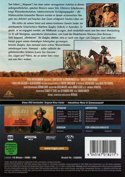 Tom Selleck ("Magnum") hat einen seiner verwegensten Auftritte in diesem außergewöhnlichen, epischen Western neuen Stils. Erbitterte Schießereien, karge Wüstenlandschaften, halsbrecherische Verfolgungsjagden - alle Markenzeichen klassischer Western werden in diesem achtionreichen Film ganz neu definiert und hauchen dem Genre erfolgreich frisches Leben ein.Mit nichts als seinem Sattel und seinem kostbaren Gewehr landet der amerikanische Scharfschütze Matthew Quigley (Selleck) in Australien. Er glaubt, er sei engagiert worden, um Wildhunde zu jagen, doch tatsächlich mutet man ihm einen Mordauftrag zu: Er soll Aborigines, australische Ureinwohner, vom Land des Rinderbarons Marston (Alan Rickman / Stirb langsam) "eliminieren". Als Quigley ablehnt, wird er rasch vom Jäger zum Gejagten. Zum tödlichen Kampf gegen seinen ehemaligen Arbeitgeber gezwungen, beweist Quigley, dass niemand einen echten Westernhelden unterkriegen kann. Niemand - außer vielleicht der geheimnisvollen Schönen (Laura San Giacomo / Sex, Lügen und Video), die an seiner Seite reitet und sein Herz erobert.