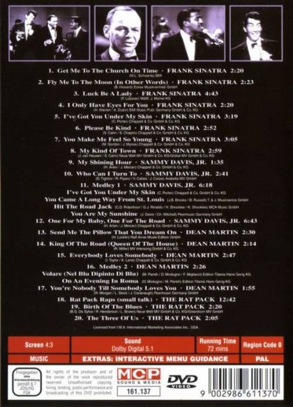 Tracklisting:01 Frank Sinatra - Get Me To The Church On Time02 Frank Sinatra - Fly Me To The Moon (In Other Words)03 Frank Sinatra - Luck Be A Lady04 Frank Sinatra - I Only Have Eyes For You05 Frank Sinatra - I've Got You Under My Skin06 Frank Sinatra - Please Be Kind07 Frank Sinatra - You Make Me Feel So Young08 Frank Sinatra - My Kind Of Town09 Sammy Davis Jr. - My Shining Hour10 Sammy Davis Jr. - Who Can I Turn To11 Sammy Davis Jr. - Medley- I've Got You Under My Skin- You Came A Long Way From St. Louis- Hit The Road Jack- You Are My Sunshine12 Sammy Davis Jr. - One For My Baby, One For The Road13 Dean Martin - Send Me The Pillow That You Dream On14 Dean Martin - King Of The Road (Queen Of The House)15 Dean Martin - Everybody Loves Somebody16 Dean Martin - Medley- Volare (Nel Blu Dipinto Du Blu)- On An Evening In Roma17 You're Nobody Till Somebody Loves You18 The Rat Pack - Rat Pack Raps (smalltalk)19 The Rat Pack - Birth Of The Blues20 The Rat Pack - The Three Of Us