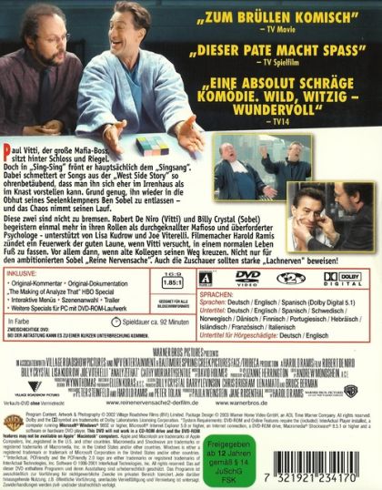 Paul Vitti, der große Mafia-Boss, sitzt hinter Schloss und Riegel. Doch in "Sing-Sing" frönt er hauptsächlich dem "Singsang". Dabei schmettert er Songs aus der "West Side Story" so ohrenbetäubend, dass man ihn sich eher im Irrenhaus als im Knast vorstellen kann. Grund genug, ihn wieder in die Obhut seines Seelenklempners Ben Sobel zu entlassen - und das Chaos nimmt seinen Lauf.Diese zwei sind nicht zu bremsen. Robert de Niro (Vitti) und Billy Crystal (Sobel) begeistern einmal mehr in ihren Rollen als durchgeknallte Mafioso und überforderter Psychologe - unterstützt von Lisa Kudrow und Joe Viterelli. Filmemacher Harold Ramis zündet ein Feuerwerk der guten Laune, wenn Vitti versucht, in einem normalen Leben Fuß zu fassen. Vor allem dann, wenn alte Kollegen seinen Weg kreuzen. Nicht nur für den ambitionierten Sobel "Reine Nervensache". Auch die Zuschauer sollten starke "Lachnerven" beweisen!