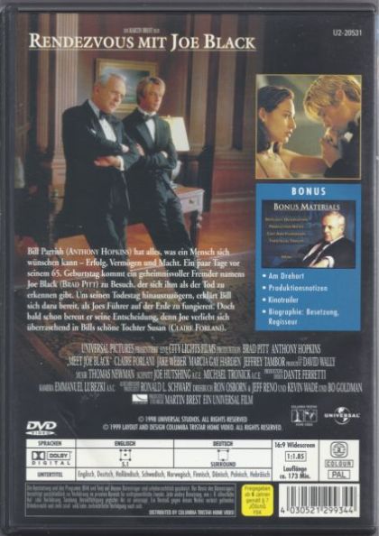 Bill Parish (ANTHONY HOPKINS) hat alles, was ein Mensch sich wünschen kann - Erfolg, Vermögen und Macht. Ein paar Tage vor seinem 65. Geburtstag kommt ein geheimnisvoller Fremder namens Joe Black (BRAD PITT) zu Besuch, der sich ihm als der Tod zu erkennen gibt. Um seinen Todestag hinauszuzögern, erklärt Bill sich dazu bereit, als Joes Führer auf der Erde zu fungieren. Doch bald schon bereut er seine Entscheidung, denn Joe verliebt sich überraschend in Bills schöne Tochter Susan (CLAIRE FORLANI).