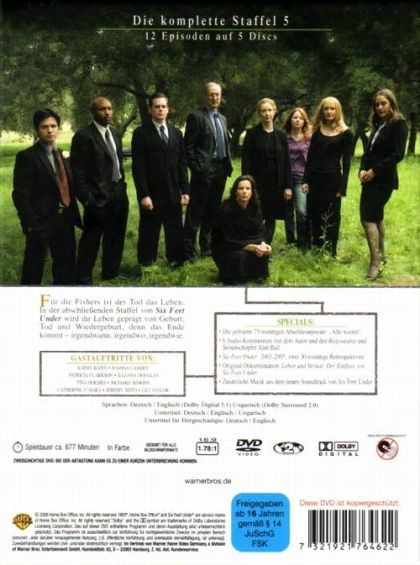 Für die Fishers ist der Tod das Leben. In der abschließenden Staffel von Six Feet Under wird ihr Leben geprägt von Geburt, Tod und Wiedergeburt, denn das Ende kommt - irgendwann, irgendwo, irgendwie.Enthält die Episoden:- Ein Anstrich weißer Farbe- Ich tanze nur für mich- Halte meine Hand- Wie die Zeit vergeht- Pfirsichkompott- Ein Regenbogen voller Gründe- Stille Andacht- Zukunftspläne- Zwischen den Welten- Allein- Rauschen- Alle warten