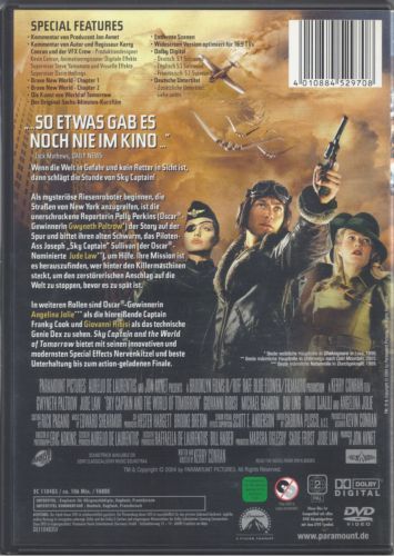 Wenn die Welt in Gefahr und kein Retter in Sicht ist, dann schlägt die Stunde von Sky Captain!Als mysteriöse Riesenroboter beginnen, die Straßen von New York anzugreifen, ist die unerschrockene Reporterin Polly Perkins (Oscar®-Gewinnerin Gwyneth Paltrow*) der Story auf der Spur und bittet ihren alten Schwarm, das Piloten-Ass Joseph "Sky Captain" Sullivan (der Oscar®-Nominierte Jude Law**), um Hilfe. Ihre Mission ist es herauszufinden, wer hinter den Killermaschinen steckt, um den zerstörerischen Anschlag auf die Welt zu stoppen, bevor es zu spät ist.In weiteren Rollen sind Oscar®-Gewinnerin Angelina Jolie*** als die hinreißende Captain Franky Cook und Giovanni Ribisi als das technische Genie Dex zu sehen. Sky Captain and the World of Tomorrow bietet mit seinen innovativen und modernsten Special Effects Nervenkitzel und beste Unterhaltung bis zum action-geladenen Finale.* Beste weibliche Hauptrolle in Shakespeare in Love, 1998.** Beste männliche Hauptrolle in Unterwegs nach Cold Mountain, 2003.*** Beste männliche Nebenrolle in Durchgeknallt, 1999.