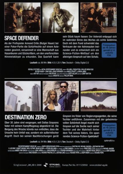 Space DefenderAls der Profispieler Armond Crille (Rutger Hauer) bei einer Poker-Partie die Schürfrechte auf einem Asteroiden gewinnt, versammelt er eine Mannschaft aus Hasardeuren und Glücksrittern, um den unerforschten Himmelskörper zu erkunden. Das Quartett kann sein Glück kaum fassen: Der Asteroid entpuppt sich im wahrsten Sinne des Wortes als echte Goldmine. Doch mit dem Fund schwindet das Vertrauen der vier Astronauten ineinander und es entwickelt sich ein Science-Fiction-Wettlauf um den alleinigen Anspruch auf den Schatz.Destination ZeroÜber 30 Jahre sind vergangen, seit Dallas Graysons Vater mit seinem Kampfflugzeug abgestürzt ist. Die Bergung des Wracks könnte nun enthüllen, dass die Ursache kein Unfall war, sondern ein außerirdischer Angriff. Doch bei seinen Nachforschungen gerät Grayson ins Visier von Regierungsagenten, die seine Tochter entführen. Zusammen mit der geheimnisvollen Schönheit Angel macht sich Grayson auf die Suche nach seiner Tochter und der Wahrheit hinter dem Tod seines Vaters. Ein spannendes Science-Fiction-Spektakel!