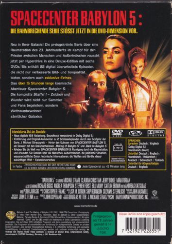 Spacecenter Babylon 5: die bahnbrechende Serie stösst jetzt in die DVD-Dimension vor.Neu in Ihrer Galaxis! Die preisgekrönte Serie über eine Raumstation des 23. Jahrhunderts im Kampf für den Frieden zwischen Menschen und Außerirdischen rauscht jetzt per Hyperdrive in eine Deluxe-Edition mit sechs DVDs. Sie enthält 22 digital überarbeitete Episoden, die nicht nur verbesserte Bild- und Tonqualität bieten, sondern auch exklusive Extras. Das über 15 Stunden lange kosmische Abenteuer Spacecenter Babylon 5: Die komplette Staffel 1 - Zeichen und Wunder wird nicht nur Sammler und Fans begeistern, sondern Weltraumbewohner sämtlicher Galaxien.1. Ragesh 32. Der Seelenjäger3. Die Purpurdaten4. Ein unheimlicher Fund5. Angriff auf G'Kar6. Die Macht des Geistes7. Angriff auf die Außerirdischen8. Gefangen im Cybernetz9. Die Todesbringerin10. Die Gläubigen11. Ein Wiedersehen mit Folgen12. Mit allen Mitteln...13. Visionen des Schreckens14. Der Gral15. Die Untersuchung16. Angriff der Aliens - Teil 117. Angriff der Aliens - Teil 218. Verloren in der Zeit19. Die Heilerin20. Im Ring des Blutes21. Krieger wider Willen22. Chrysalis