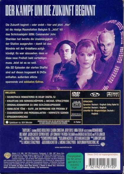 EPISODE 1: IN DER STUNDE DES WOLFSBeim Einsatz vermisst: Sheridan und Garibaldi. Ivanova organisiert eine Suchaktion, um den Commander aufzuspüren. Doch die Mitglieder der Allianz sind zu keiner Hilfe bereit, denn sie halten sich an das ominöse Sprichwort: „Von Z’ha’dum kehrt niemand zurück.“ EPISODE 2: DER LETZTE DES KHA’RI?Einen Freund lässt man nicht im Stich: G’Kar sucht intensiv nach Garibaldi, seinem ersten Freund, der kein Narn ist. Unterdessen begegnet Sheridan dem geheimnisvollen Lorien und schöpft wieder Hoffnung – vielleicht gibt es einen Ausweg. EPISODE 3: RÜCKKEHR VOM SCHATTENPLANETENDelenns öffentlicher Versuch, die Liga-Welten für die Allianz gegen die Schatten zu gewinnen, scheint zu scheitern, bis unerwartet Sheridan bei der Zusammenkunft auftaucht. Auch Garibaldi kehrt zurück… doch irgendetwas scheint mit ihm nicht zu stimmen. EPISODE 4: DAS MONSTER AUF DEM THRONMüllentsorgung im Stil des 23. Jahrhunderts: Während Sheridan den Vorlonenbotschafter endgültig loswerden will, wendet Mollari einen listigen Plan an, um Cartagia auszutricksen. Delenn erfährt, das Sheridans Tage gezählt sind. Insgesamt sind 22 Episoden vorhanden.