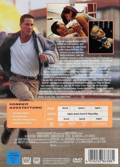 Er ist ein Cop aus der Anti-Terror-Einheit von Los Angeles. Und so ist der Alarm für Jack Traven nichts Ungewöhnliches: Ein Terrorist will drei Millionen Dollar erpressen, oder die zufälligen Geiseln in einem Aufzug fallen 35 Stockwerke in die Tiefe. Doch Jack schafft das Unmögliche - die Geiseln werden gerettet und der Terrorist stirbt an seiner eigenen Bombe. Scheinbar. Denn schon wenig später steht Jack (Keanu Reeves) dem Bombenexperten Payne erneut gegenüber. Diesmal hat sich der Erpresser eine ganz perfide Mordwaffe ausgedacht: Er plaziert eine Bombe in einem öffentlichen Bus. Der Mechanismus der Sprengladung schaltet sich automatisch ein, sobald der Bus schneller als 50 Meilen in der Stunde fährt und detoniert sofort, sobald die Geschwindigkeit sinkt. Plötzlich wird für eine Handvoll ahnungsloser Durchschnittsbürger der Weg zur Arbeit zum Höllentrip - und nur Jack hat ihr Leben in der Hand. Als der Busfahrer verletzt wird, übernimmt Fahrgast Annie (Sandra Bullock) das Steuer. Doch wohin mit einem Bus, der nicht bremsen kann in der Stadt der Staus? Doch es kommt noch schlimmer: Payne (Dennis Hopper) will jetzt nicht nur "seine" drei Millionen Dollar. Er will Jack. Um jeden Preis.