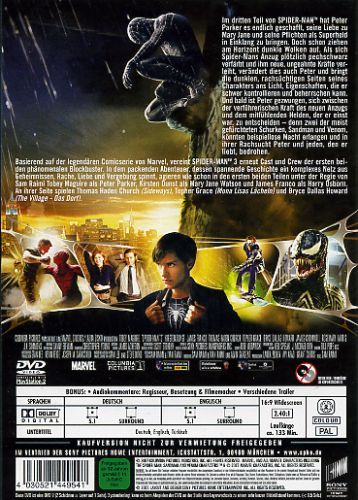 Im dritten Teil von SPIDER-MAN™ hat Peter Parker es endlich geschafft, seine Liebe zu Mary Jane und seine Pflichten als Superheld in Einklang zu bringen. Doch schon ziehen am Horizont dunkle Wolken auf. Als sich Spider-Mans Anzug plötzlich pechschwarz verfärbt und ihm neue, ungeahnte Kräfte verleiht, verändert dies auch Peter und bringt die dunklen, rachsüchtigen Seiten seines Charakters ans Licht, Eigenschaften, die er schwer kontrollieren und beherrschen kann. Und bald ist Peter gezwungen, sich zwischen der verführerischen Kraft des neuen Anzugs und dem mitfühlenden Helden, der er einst war, zu entscheiden - denn zwei der meist gefürchteten Schurken, Sandman und Venom, könnten beispiellose Macht erlangen und in ihrer Rachsucht Peter und jeden, den er liebt, bedrohen.Basierend auf der legendären Comicserie von Marvel, vereint SPIDER-MAN™ 3 erneut Cast und Crew der ersten beiden phänomenalen Blockbuster. In dem packenden Abenteuer, dessen spannende Geschichte ein komplexes Netz aus Geheimnissen, Rache, Liebe und Vergebung spinnt, agieren wie schon in den ersten beiden Teilen unter der Regie von Sam Raimi Tobey Maguire als Peter Parker, Kirsten Dunst als Mary Jane Watson und James Franco als Harry Osborn. An ihrer Seite spielen Thomas Haden Church (Sideways), Topher Grace (Mona Lisas Lächeln) und Bryce Dallas Howard (The Village - Das Dorf).