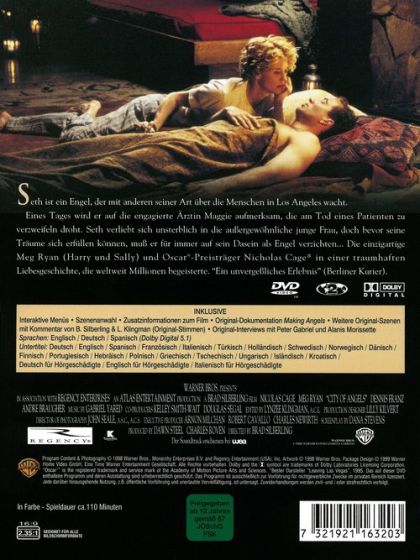 Seth ist ein Engel, der mit anderen seiner Art über die Menschen in Los Angeles wacht. Eines Tages wird er auf die engagierte Ärztin Maggie aufmerksam, die am Tod eines Patienten zu verzweifeln droht. Seth verliebt sich unsterblich in die außergewöhnliche junge Frau, doch bevor seine Träume sich erfüllen können, muß er für immer auf sein Dasein als Engel verzichten... Die einzigartige Meg Ryan (Harry und Sally) und Oscar-Preisträger Nicolas Cage in einer traumhaften Liebesgeschichte, die weltweit Millionen begeisterte. `Ein unvergeßliches Erlebnis` (Berliner Kurier).