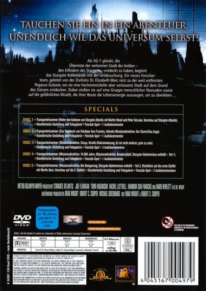 Als SG-1 glaubt, die Überreste der verlorenen Stadt der Antiker - die Erfinder der Stargates - entdeckt zu haben, beginnt das Stargate Kommando mit der Untersuchung. Ein neues Forscherteam, geleitet von der Zivilistin Dr. Elizabeth Weir, reist zu der weit entfernten Pegasus- Galaxie, wo sie eine hochentwickelte, aber verlassene Stadt auf dem Grund des Ozeans entdecken. Dabei stoßen sie auf eine Gruppe menschlicher Nomaden sowie auf die gefährlichen Wraith, die ihrer Beute die Lebensenergie aussaugen um zu überleben ...Episoden:1. Aufbruch in eine neue Welt, Teil 1 2. Aufbruch in eine neue Welt, Teil 2 3. Dunkle Schatten 4. 38 Minuten 5. Unter Verdacht 6. Selbstopfer 7. Tödliche Verteidigung 8. Im Untergrund 9. Zurück auf die Erde 10. Der Sturm 11. Das Auge 12. Der Überlebende 13. Hot Zone 14. Chaya 15. 10.000 Jahre 16. Bruderschaft 17. Nachrichten aus der Pegasus-Galaxie 18. Die Gabe 19. Die Belagerung, Teil 1 20. Die Belagerung, Teil 2