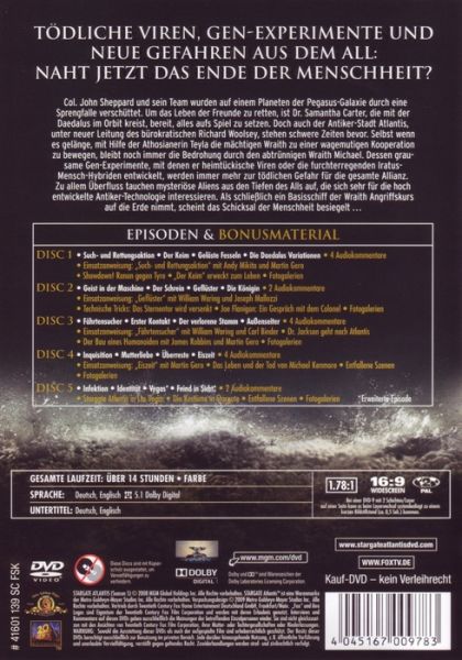 Episoden:-----DVD 1------5x01 Such- und Rettungsaktion-5x02 Der Keim-5x03 Gelöste Fesseln-5x04 Die Daedalus Variationen-----DVD 2------5x05 Geist in der Maschine-5x06 Der Schrein-5x07 Geflüster-5x08 Die Königin-----DVD 3------5x09 Fährtensucher-5x10 Erster Kontakt-5x11 Der verlorene Stamm-5x12 Außenseiter-----DVD 4------5x13 Inquisition-5x14 Mutterliebe-5x15 Überreste-5x16 Eiszeit-----DVD 5------5x17 Infektion-5x18 Indentität-5x19 Vegas-5x20 Feind in SichtInhaltsangabe:Tödliche Viren, Gen-Experimente und neue Gefahren aus dem All: Naht jetzt das Ende der Menschheit?Col. John Sheppard und sein Team wurden auf einem Planeten der Pegasus-Galaxie durch eine Sprengfalle verschüttet. Um das Leben seiner Freunde zu retten, ist Dr. Samantha Carter, die mit der Daedalus im Orbit kreist, bereit, alles aufs Spiel zu setzen. Doch auch der Antiker-Stadt Atlantis, unter neuer Leitung des bürokratischen Richard Woolsey, stehen schwere Zeiten bevor. Selbst wenn es gelänge, mit Hilfe der Athosianerin Teyla die mächtigen Wraith zu einer wagemuitigen Kooperation zu bewegen, bleibt noch immer die Bedrohung durch den abtrünnigen Wraith Michael. Dessen grausame Gen-Experimente, mit denen er heimtückische Viren oder die furcherregenden Iratus-Mensch-Hybriden entwickelt, werden immer mehr zur tödlichen Gefahr für die gesamte Allianz. Zu allem Überfluss tauchen mysteriöse Aliens aus den Tiefen des Alls auf, die sich sehr für die hoch entwickelte Antiker-Technologie interessieren. Als schließlich ein Basisschiff der Wraith Angriffskurs auf die Erde nimmt, scheint das Schicksal der Menschheit besiegelt...
