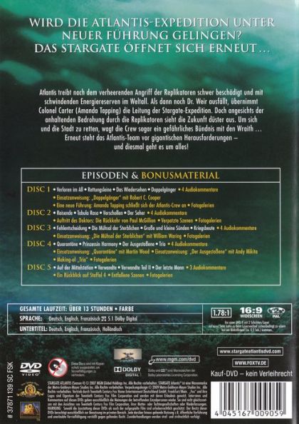 WIRD DIE ATLANTIS-EXPEDITION UNTER NEUER FÜHRUNG GELINGEN?DAS STARGATE ÖFFNET SICH ERNEUT...Atlantis treibt nach dem verheerenden Angriff der REplikatoren schwer beschädigt und mit schwindenden Energiereserven im Weltall. Als dann noch Dr. Weir ausfällt, übernimmt Colonel Carter (Amanda Tapping)die Leitung der Stargate-Expedition. Doch angesichts der anhaltenden Bedrohung durch die Replikatoren sieht die Zukunft düster aus. Um sich und die Stadt zu retten, wagt die Crew sogar ein gefährliches Bündnis mit den Wraith...Erneut steht das Atlantis-Team vor gigantischen Herausforderungen - und diesmal geht es um alles!