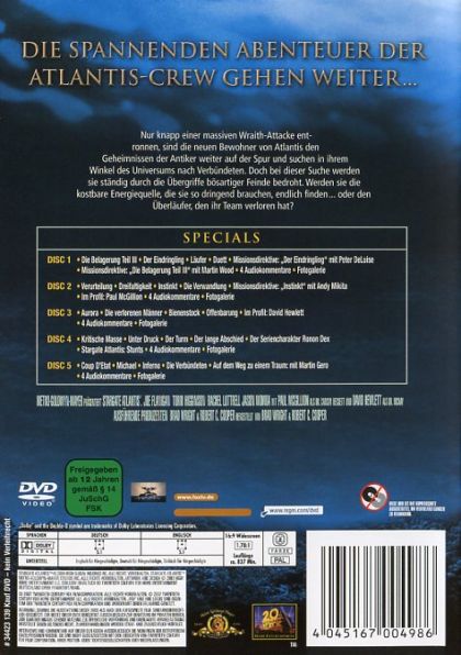 2.01 (21) DIE BELAGERUNG (TEIL 3):Lieutenant Aiden Ford erholt sich nach seiner Begegnung mit einem Wraith so rasch, dass Dr. Becket befürchtet, er könnte mit einem Wraith-Enzym infiziert sein. Alle Team-Mitglieder sind erleichtert, dass sie den ersten Angriff der Wraith auf Atlantis überlebt haban - doch die Freude währt nur kurz, denn die Wraith bereiten schon ihre nächste Angriffswelle vor. McKay entwickelt einen radikalen Plan. Aber wird die Zeit dafür noch ausreichen?2.02 (22) DER EINDRINGLING:Ein Mitglied der Crew wird getötet, und McKay meint, eine Stromstörung sei daran schuld. Als ein weiteres Crewmitglied getötet wird, vermutet er jedoch faules Spiel dahinter. Ein von den Wraith kodierter Virus, der binnen kurzem die Kontrolle über die Computersysteme übernimmt, versetzt ihn in Alarmbereitschaft. Die Crew verliert zunehmend die Gewalt über die Dädalus. In einem Wettlauf gegen die Zeit versuchen sie zu verhindern, dass sich das Raumschiff gegen sie selbst wendet.2.03 (23) DER LÄUFER:Auf ihrer Suche nach Ford, der von einem Wraith infiziert wurde, trifft das Team auf Ronon Dex, einen furchtlosen Krieger, der einen Kampf mit einem Wraith überlebt hat und seitdem ständig auf der Flucht ist. Ronon eröffnet ihnen, dass er Fords Aufenthaltsort kennt. Doch als sie Ford dann finden, wird ihnen schnell klar, dass sie ihn vielleicht nie mehr aus seiner jetzigen Existenz werden erlösen können.2.04 (24) DUETT:Nach einem unerwarteten Amgriff sind Dr. McKay und das neue Crewmitglied Lieutenant Laura Cadman ein einem Dematerialisierungsgerät im Inneren eines Wraith Dart eingeschlossen. Bei dessen Absturz werden sie gerettet und es gelingt Dr. Zalenka, McKay wieder zu materialisieren. McKay entdeckt jedoch einen ungebetenen Gast in seinem Körper. Cadmans Bewusstsein ist mit ihm herausgeholt worden und spukt jetzt ebenfalls in seinem Kopf herum!2.05 (25) VERURTEILT:Das Team besucht einen technologisch fortschrittlichen Planeten, dessen Zivilisation mysteriöserweise von den Wraith verschont geblieben ist. Es berichtet Dr. Weir von seiner Entdeckung. Doch in ihr keimt der Verdacht auf, die idyllische Atmosphäre könnte auf einem unheilvollen Pakt zwischen dem Führer des Planeten und den Wraith beruhen.2.06 (26) DREIFALTIGKEIT:Das Atlantis-Team glaubt, eine neue Energiequelle für die Stadt entdeckt zu haben, basierend auf unausgereifter Antiker-Technologie. Doch aus Hoffnung wird Furcht, als McKays erster Versuch mit einem Toten endet. Kann McKay die Schwachstellen der Antiker-Technologie beseitigen, ohne sich selbst und Sheppard in tödliche Gefahr zu bringen?2.07 (27) INSTINKT:Das Team begegnet dem Wissenschaftler Zaddik, der mit dem Mädchen Elija, einem Wraith-Kind, zusammenlebt. Dr. Becket trifft sich mit Zaddik, um an Elija ein kontrolliertes Experiment mit einem Retrovirus durchzuführen, den er entwickelt hat. Doch die Formel ist noch nicht ganz ausgereift und bewirkt das Gegenteil des gewünschten Effekts.2.08 (28) DIE VERWANDLUNG:Nach seiner Begegnung mit einem mutierten Wraith-Kind zeigt Sheppard Symptome ähnlich denen, die Ford nach seiner Wraith-Attacke geplagt haben. Dr. Beckett wird klar, dass Sheppards Blutkreislauf jetzt eine kleine Menge des Retrovirus' aufweist. In einem Wettlauf gegen die Zeit versucht das Team, Sheppards Leben zu retten.2.09 (29) AURORA:Das Team entdeckt hunderte von Besatzungsmitgliedern, die eingefroren in Stasis-Kammern über ein Interface in einer virtuellen Realität kommunizieren. Sheppard klettert in eine leere Kammer und verbindet sich mit dem Interface. In einer der Kammern wird ein Wraith entdeckt. Das Team muss verhindern, dass der Wraith die gleichen Geheimnisse der Antiker erfährt, nach denen auch sie suchen.2.10 (30) DIE VERLORENEN MÄNNER:Sheppard, McKay, Teyla und Ronon werden in einen Hinterhalt gelockt und finden sich als Gefangene von Lieutenant Aiden Ford wieder. Ford will beweisen, dass das Wraith-Enzym sicher und anwendbar ist, und verabreicht ihnen das Mittel heimlich mit dem Essen. Anschließend befiehlt er dem Team, bei einer besonderen Mission zu helfen: der Zerstörung eines Hive-Schiffs der Wraith.2.11 (31) BIENENSTOCK:Sheppard, Teyla, Ronon und Ford versuchen, von dem Schiff zu entkommen, auf dem sie als Geiseln gefangen gehalten werden. Auf Fords Planet injiziert McKay sich selbst eine Überdosis Wraith-Enzym, damit er seine Bewacher überwältigen Kann. McKay und Caldwell versuchen alles, um den Rest des Teams in Sicherheit zu bringen.2.12 (32) OFFENBARUNG:Das Atlantis-Team entdeckt ein Tor mit Zeichen der Antiker, und Sheppard wird aus Versehen auf die andere Seite hindurchgesogen. Weir entdeckt, dass Sheppard in ein Feld transportiert wirde, das die Zeit ausdehnt. Es scheint, als ob die Inschriften auf dem Stein eine Warnung enthalten: Ist das Tor durchquert, gibt es keine Wiederkehr.2.13 (33) KRITISCHE MASSE:Das Team findet heraus, dass die Goa'uld eine Bombe auf Atlantis installiert haben - jegliche Überlastung würde eine Explosion hervorrufen. Die Stadt muss getarnt werden, um für die Wraith unsichtbar zu bleiben. Damit würde man jedoch die Energiequelle aktivieren, die eine Detonation auslösen könnte. Weir entdeckt, dass sich der Eindringling in den eigenen Reihen befindet.2.14 (34) UNTER DRUCK:Während eines Testflugs verlieren McKay und ein Pilot plötzlich die Kontrolle und stürzen in den Ozean. Der Jumper sinkt zum Grund des Ozeans, und der Aufprall verursacht einen kleinen Riss, durch den Wasser eindringt. Weir und Sheppard denken sich einen Rettungsplan aus. Aber können sie ihn umsetzen, bevor die Zeit abläuft?2.15 (35) DER TURM:Das Team wird dem Führer eines Ortes vorgestellt, der die Gabe hat, die Bewohner vor den Wraith zu schützen. Der Lord entdeckt, dass Sheppard ebenfalls das Antiker-Gen besitzt, das benötigt wird, um das Dorf zu schützen. Er beschließt, dass Sheppard in seine Familie einheiraten und sein Nachfolger werden soll.2.16 (36) DER LANGE ABSCHIED:Ein Energiestrah