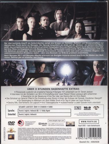 Der überraschende Angriff von Außerirdischen zwingt eine Gruppe von Soldaten, Zivilisten und Wissenschaftlern zur überstürzten Flucht durch ein Stargate. Der Sprung katapultiert sie direkt auf die „Destiny“, ein verlassenes Raumschiff, das Lichtjahre von der Erde entfernt auf einem festgelegten Kurs von Planet zu Planet durchs Universum rast. Auf ihrer Reise ins Ungewisse wird die Besatzung um Col. Young (Justin Louis) und Dr. Rush (Robert Carlyle) nicht nur mit Gefahren jenseits aller Vorstellungskraft konfrontiert, sondern muss sich auch persönlichen Ängsten und zwischenmenschlichen Problemen stellen – denn eine Rückkehr zur Erde ist praktisch aussichtslos. Nach Stargate SG-1 und Stargate Atlantis erforscht mit Stargate Universe erneut eine Crew die Weiten des Weltraums. Diesmal gibt es scheinbar kein Zurück...Erste Season Episoden Liste:Pilotepisode01. Finsternis02. Der Flug ins Licht03. Ausserirdische Invasion04. Die Rückkehr05. Die Zeitreise06. Gefahr für die Destiny07. Mordverdacht08. Weltraum09. Uneins10. Glaube11. Der Genetische Code12. Verloren13. Sabotage14. Halluzinationen15. Die Luzianer-Allianz16. Feindlicher Übergriff, Teil 117. Feindlicher Übergriff, Teil 2