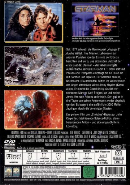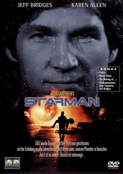 Seit 1977 schwebt die Raumkapsel "Voyager 2" durchs Weltall. Ihre Mission: Lebewesen auf anderen Planeten von der Existenz der Erde zu berichten und sie zu uns einzuladen. Jetzt ist der erste Gast da: Starman - der liebenswerteste Außerirdische seit Galaxis-Gnom E.T. Doch statt mit Pauken und Trompeten empfängt die Air Force ihn mit Bomben und Raketen. Der Starman muss im Norden der USA notlanden. Mitten im Wohnzimmer der jungen attraktiven Witwe Jenny Hayden (Karen Allen). Er nimmt die Gestalt ihres kürzlich verstorbenen Mannes (Jeff Bridges) an und zwingt Jenny, ihn nach Arizona zu bringen. Dort soll er in drei Tagen von seinen Artgenossen wieder abgeholt werden. Es beginnt eine gefährliche 3000 Meilen Jagd quer durch die Vereinigten Staaten.Ein weiterer Film von "Christine"-Regisseur John Carpenter: faszinierende Science-Fiction, atemberaubende Action - und eine ungewöhnliche Lovestory.