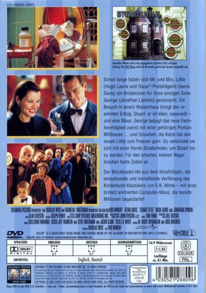 Schon lange haben sich Mr. und Mrs. Little (Hugh Laurie und Oscar-Preisträgerin Geena Davis) ein Brüderchen für ihren einzigen Sohn George (Jonathan Lipnicki) gewünscht. Ein Besuch in einem Waisenhaus bringt den ersehnten Erfolg. Stuart: er ist klein, naseweiß - und eine Maus. George beäugt das neue Familienmitglied zuerst mit einer gehörigen Portion Mißtrauen ... und Snowbell, die Katze hat den neuen Little zum Fressen gern. So verbündet sie sich mit einer Horde Straßenkater, um Stuart los zu werden. Für den smarten, kleinen Nager brechen harte Zeiten an ...Der Blockbuster-Hit aus dem Kinofrühjahr, die sensationelle und hinreißende Verfilmung des Kinderbuch-Klassikers von E.B.White - mit einer brillant animierten Computer-Maus, die bereits Millionen begeisterte!