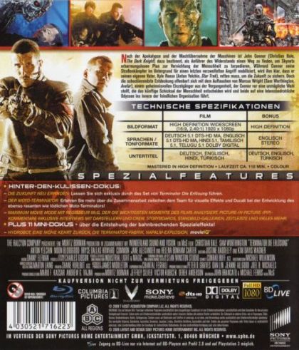 Nach der Apokalypse und der Machtübernahme der Maschinen ist John Connor (Christian Bale, The Dark Knight) dazu bestimmt, als Anführer des Widerstands einen Weg zu finden, um Skynets erbarmungslosen Plan zur Vernichtung der Menschheit zu torpedieren. Während Connor seine Straßenkämpfer im Untergrund für einen letzten verzweifelten Angriff mobilisiert, wird ihm klar, dass er seinen eigenen Vater, Kyle Reese (Anton Yelchin, Star Trek), retten muss, um die Zukunft zu sichern. Doch die schockierendste Entdeckung offenbart sich mit dem Auftauchen von Marcus Wright (Sam Worthington, Avatar), einem geheimnisvollen Einzelgänger aus der Vergangenheit, der Connor vor eine unmögliche Wahl stellt, die das künftige Schicksal der Menschheit entscheiden wird und beide auf eine lebensbedrohliche Odyssee ins Innere der feindlichen Organisation führt.