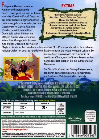 Fliegende Betten, tanzende Kleider und abstürzende Besen – was geht nur vor im Haus von Miss Caroline Price? Dass sie bei einer äusserst ungewöhnlichen Lady untergebracht wurden, ist den Geschwistern Carrie, Paul und Charlie ziemlich schnell klar. Doch bald schon können die pfiffigen Kinder das Geheimnis lüften: Ihre Gastgebe Price manchmal so ihre Schwierigkeiten, fehlt ihr doch zur perfekten Zauberin noch die letzte wichtige Lektion. So führen ihre Hexenkünste die aufregendsten Abenteuer.Ein Oscar®-prämiertes Disney-Meisterwerk, das durch seine faszinierende Kombination aus Real- und Zeichentrickfilm besticht.
