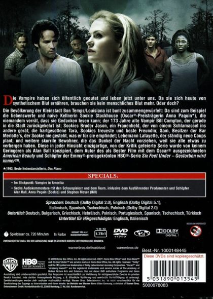 Die Vampire haben sich öffentlich geoutet und leben jetzt unter uns. Da sie sich heute von synthetischem Blut ernähren, brauchen sie kein menschliches Blut mehr. Oder doch? Die Bevölkerung der Kleinstadt Bon Temps/Louisiana ist bunt zusammengewürfelt: Da sind zum Beispiel die liebenswerte und naive Kellnerin Sookie Stackhouse (Oscar®-Preisträgerin Anna Paquin*), die niemandem verrät, dass sie Gedanken lesen kann; der 173 Jahre alte Vampir Bill Compton, der gerade in die Stadt zurückkehrt ist; Sookies Bruder Jason, ein Frauenheld, der von einem Schlamassel ins andere gerät; die hart gesottene Tara, Sookies treueste und beste Freundin; Sam, Besitzer der Bar Merlotte's, der Sookie nie gesteht, was er für sie empfindet; Lebemann Lafayette, der ständig neue Coups plant; und weitere skurrile Bewohner, die das Dunkel der Nacht vorziehen, weil sie alle etwas zu verbergen haben. Diese in Jeder Hinsicht einzigartige, von der Kritik gefeierte Serie wurde von keinem Geringeren als Alan Ball kozipiert, dem Autor des als Bester Film mit dem Oscar® ausgezeichneten American Beauty und Schöpfer der Emmy®-preisgekrönzen HBO®-Serie Six Feet Under – Gestorben wird immer.*1993, Beste Nebendarstellerin, Das PianoEpisoden:01 Strange Love02 Blut geleckt03 Sie gehört zu mir04 Flucht aus dem Drachenhaus05 Funkenflug06 Kalte Erde07 Brennende Leidenschaft08 Der vierte Mann im Feuer09 Plaisir D' Amour10 Gefährliches Spiel11 Begräbnis aus Liebe12 Du wirst mein Tod sein