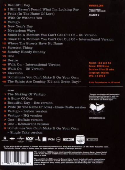 Track List:1. Beautiful Day2. Still Haven't Found What I'm Looking For3. Pride (In The Name Of Love)4. With Or Without You5. Vertigo6. New Year's Day7. Mysterious Ways8. Stuck In A Moment You Can't Get Out Of9. Where The Streets Have No Name10. Sweetest Thing11. Sunday Bloody Sunday12. One13. Desire14. Walk On15. Elevation16. Sometimes You Can't Make It On Your Own17. The Saints Are Coming18. Window In The SkiesExtras- The Making Of Vertigo;- The Making Of One; - Beautiful Day (Eze version); - Pride (In The Name Of Love) (Live from Slane Castle version); - Vertigo (Lisbon version);- Vertigo (HQ version); - One (Buffalo version);- One (restaurant version); - Sometimes You Can't Make It On Your Own (single version