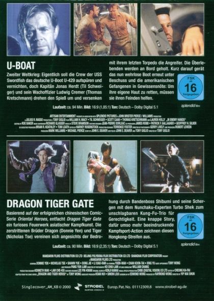 U-BOATZweiter Weltkrieg: Eigentlich soll die Crew der USS Swordfish das deutsche U-Boot U-429 aufspüren und vernichten, doch Kapitän Jonas Herdt (Til Schweiger) und sein Wachoffizier Ludwig Cremer (Thomas Kretschmann) drehen den Spieß um und versenken mit ihrem letzten Torpedo die Angreifer. Die Überlebenden werden an Bord geholt. Kurz darauf gerät das nun wehrlose Boot erneut unter Beschuss und die amerikanischen Gefangenen in Fewissensnöte: Um ihre eigene Haut zu retten, müssen sie ihren Feinden helfen.DRAGON TIGER GATEBasierend auf der erfolgreichen chinesischen Comic-Serie Oriental Heroes, entfacht Dragon Tiger Gate ein furioses Feuerwerk asiatischer Kampfkunst. Die zerstrittenen Brüder Dragon (Donnie Yen) und Tiger (Nicholas Tse) vereinen sich angesichts der Bedrohung durch Bandenboss Shibumi und seine Schergen mit dem Nunchaku-Esperten Turbo Shek zum unschlagbaren Kung-Fu-Trio für Gerechtigkeit. Eine knappe Story, dafür umso mehr beeindruckende Kampfsport-Action zeichnen diesen Hongkong-Streifen aus.