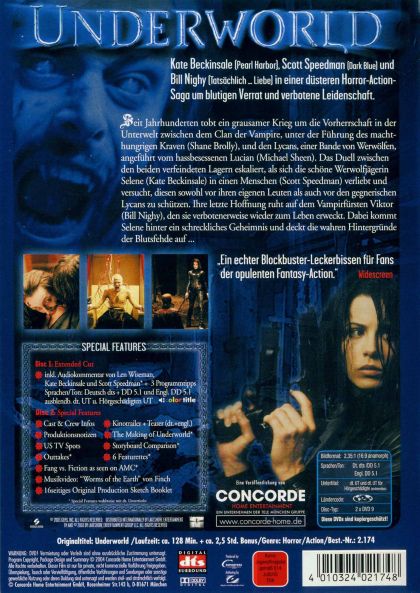 Kate Beckinsale (Pearl Harbor), Scott Speedman (Dark Blue) und Bill Nighy (Tatsächlich ... Liebe) in einer düsteren Horror-Action-Saga um blutigen Verrat und verbotene Leidenschaft.Seit Jahrhunderten tobt ein grausamer Krieg um die Vorherrschaft in der Unterwelt zwischen dem Clan der Vampire, unter der Führung des machthungrigen Kraven (Shane Brolly), und den Lycans, einer Bande von Werwölfen, angeführt vom hassbesessenen Lucian (Michael Sheen). Das Duell zwischen den beiden verfeindeten Lagern eskaliert, als sich die schöne Werwolfjägerin Selene (Kate Beckinsale) in einen Menschen (Scott Speedman) verliebt und versucht, diesen sowohl vor ihren eigenen Leuten als auch vor den gegnerischen Lycans zu schützen. Ihre letzte Hoffnung ruht auf dem Vampirfürsten Viktor (Bill Nighy), den sie verbotenerweise wieder zum Leben erweckt. Dabei kommt Selene hinter ein schreckliches Geheimnis und deckt die wahren Hintergründe der Blutsfehde auf ...