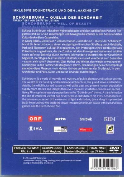 Präsentiert von Sir Peter Ustinov.Eine Dokumentation von Georg Riha.Schloss Schönbrunn mit seinen Nebengebäuden und dem weitläufigen Park mit Tiergarten zählt auf Grund seiner langen und bewegten Geschichte zu den bedeutendsten Kulturdenkmälern Österreichs.In Georg Rihas "Universum"-Dokumentation bricht Sir Peter Ustinov zu einem einzigartigen filmischen Streifzug durch Gebäude, Park und Tiergarten auf.Der Bogen des Films führt inhaltlich wie visuell vom Detail zum Gesamten - spannt sich vom Frühsommer, über Herbst und Winter, den wieder erwachenden Frühling bis in den Sommer des folgenden Jahres.